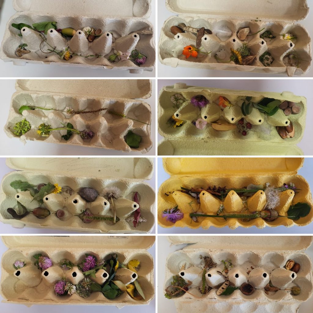 Nous avons réalisé le défi « boîte à œufs de la diversité » afin d’entrer dans le thème de la biodiversité par les sens, en lien avec le langage et d’observer activement la diversité des organismes dans un environnement proche de l’école, ici la forêt du Neuland.